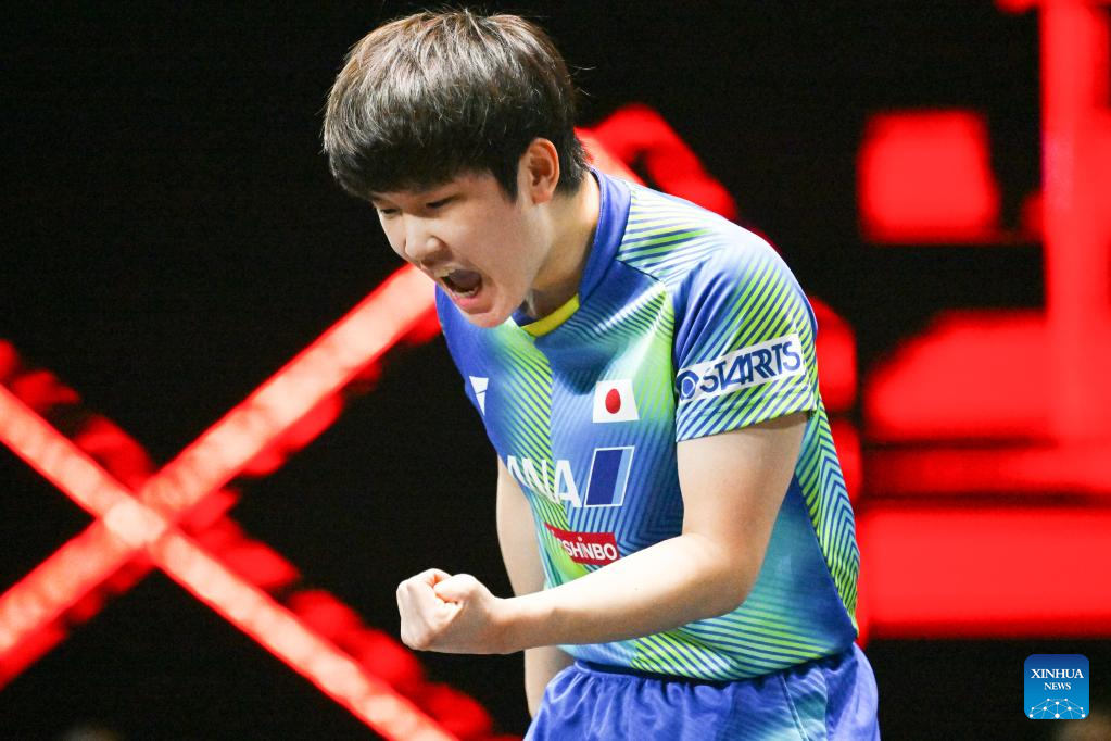 Harimoto Tomokazu of Japan reacts during the men's singles round of 64 match against Xiang Peng of China at World Table Tennis (WTT) Singapore Smash in Singapore on March 12, 2023. (Photo by Then Chih Wey/Xinhua)