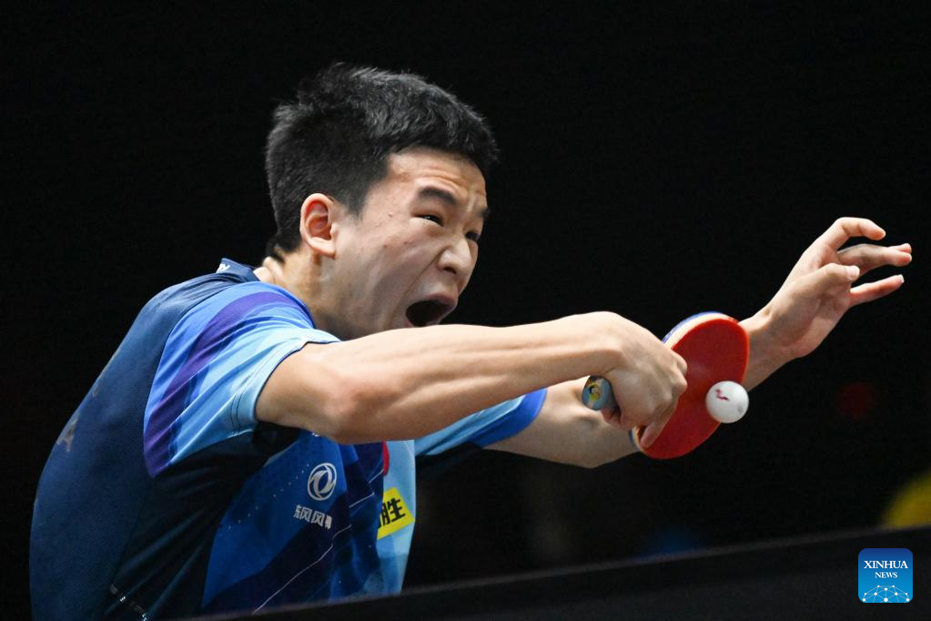 Xiang Peng of China hits a return during the men's singles round of 64 match against Harimoto Tomokazu of Japan at World Table Tennis (WTT) Singapore Smash in Singapore on March 12, 2023. (Photo by Then Chih Wey/Xinhua)