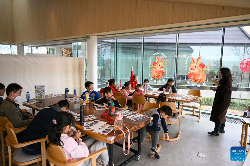 Children learn to make handicrafts out of recycled materials at the "eden Chunshanli" life demonstration area in Jizhou District, north China's Tianjin, March 11, 2023. (Xinhua/Sun Fanyue)