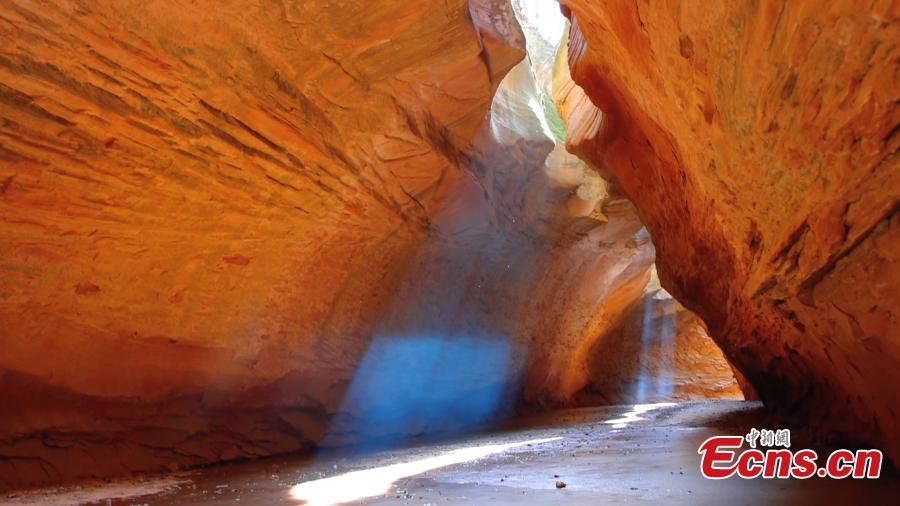 Sunshine casts into the Ganquan canyon through the fissures, creating mysterious beauty at Ganquan County of Yan'an, northwest China's Shaanxi Province. Rain, water and wind over millions of years has sculpted its red sandstone into various textures and shapes. (Photo: China News Service/Bai Teng)