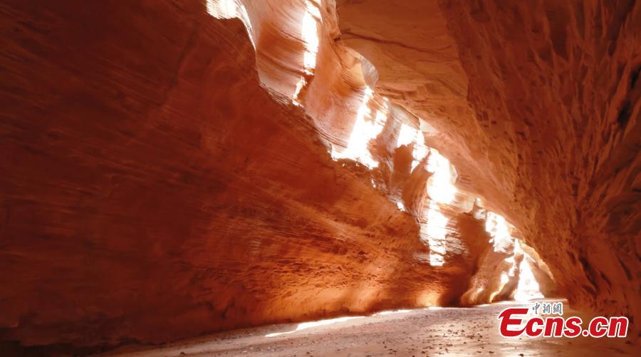 Sunshine casts into the Ganquan canyon through the fissures, creating mysterious beauty at Ganquan County of Yan'an, northwest China's Shaanxi Province. Rain, water and wind over millions of years has sculpted its red sandstone into various textures and shapes. (Photo: China News Service/Bai Teng)
