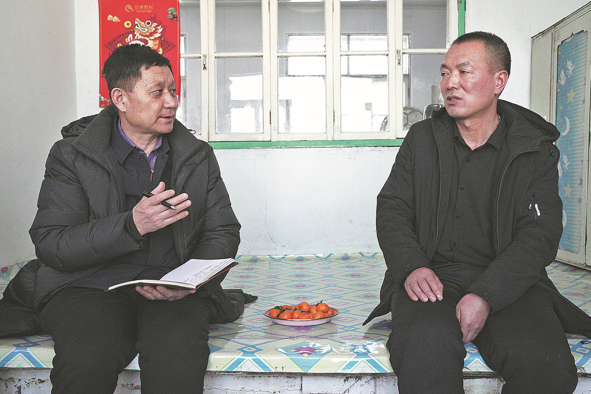 NPC deputy Sun Bin (left) discusses issues with a local resident to collect suggestions in a village in Huanan county, Heilongjiang province, last month. [WANG JIANWEI/XINHUA]