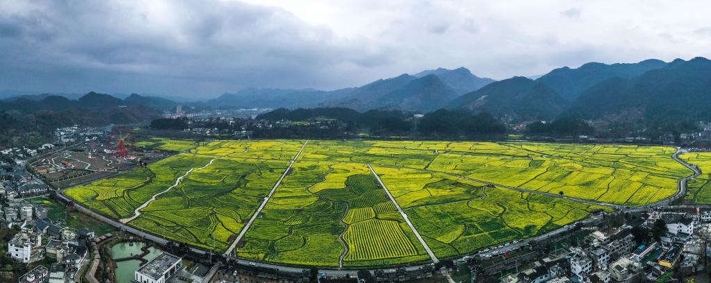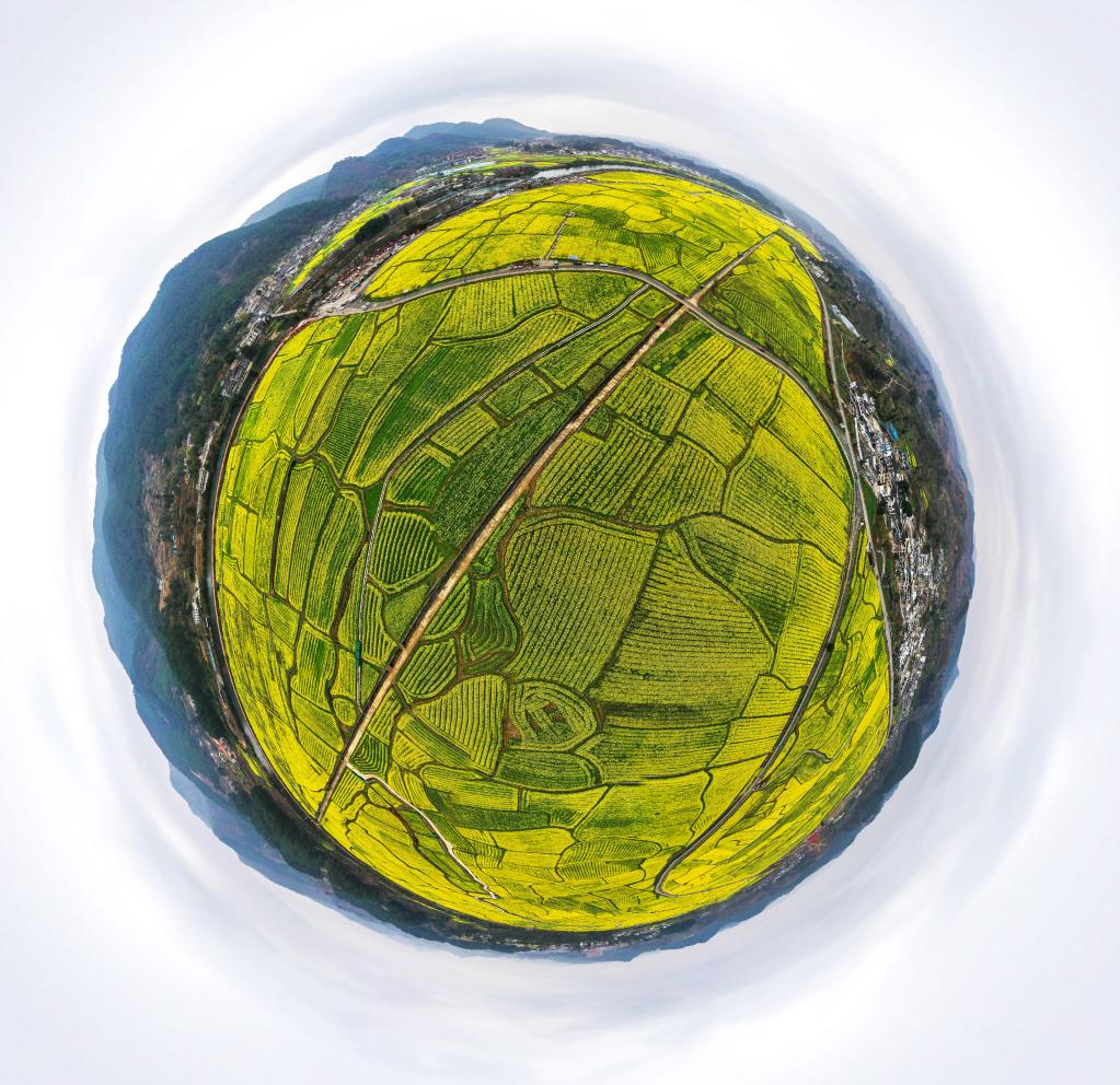 This aerial panorama photo taken on March 12, 2023 shows cole flower fields in Panjiang Township of Guiding County, southwest China's Guizhou Province. (Xinhua/Yang Wenbin)