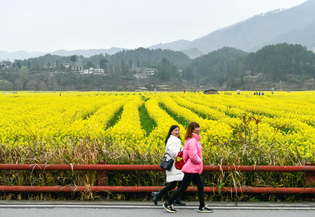 People visit cole flower fields in Panjiang Township of Guiding County, southwest China's Guizhou Province, March 12, 2023. (Xinhua/Yang Wenbin)