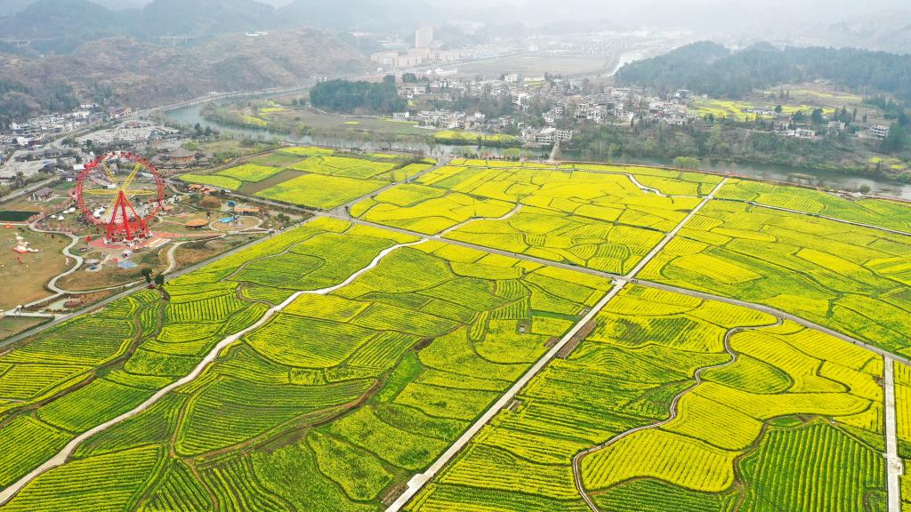 This aerial photo taken on March 12, 2023 shows cole flower fields in Panjiang Township of Guiding County, southwest China's Guizhou Province. (Xinhua/Yang Wenbin)