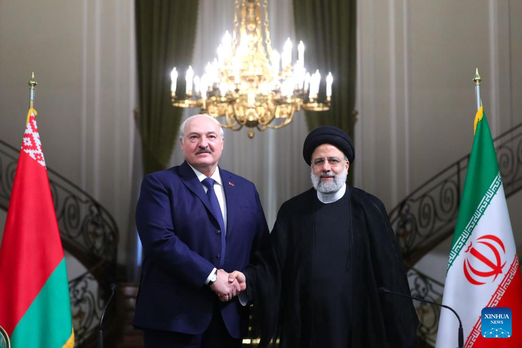 Iranian President Ebrahim Raisi (R) shakes hands with Belarusian President Alexander Lukashenko in Tehran, Iran, on March 13, 2023. Iran and Belarus on Monday set a roadmap for expanding their comprehensive cooperation and signed seven cooperation agreements in the fields of trade, transportation, agriculture and culture. (Iranian Presidential Website/Handout via Xinhua)