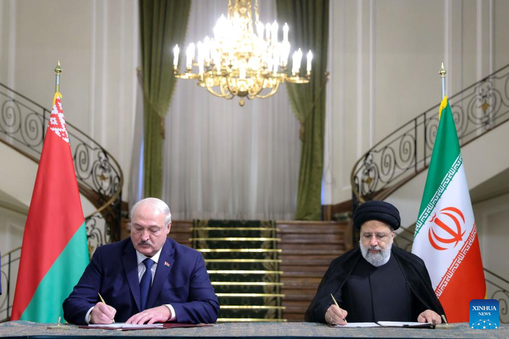 Iranian President Ebrahim Raisi (R) and Belarusian President Alexander Lukashenko sign cooperation agreements in Tehran, Iran, on March 13, 2023. Iran and Belarus on Monday set a roadmap for expanding their comprehensive cooperation and signed seven cooperation agreements in the fields of trade, transportation, agriculture and culture. (Iranian Presidential Website/Handout via Xinhua)