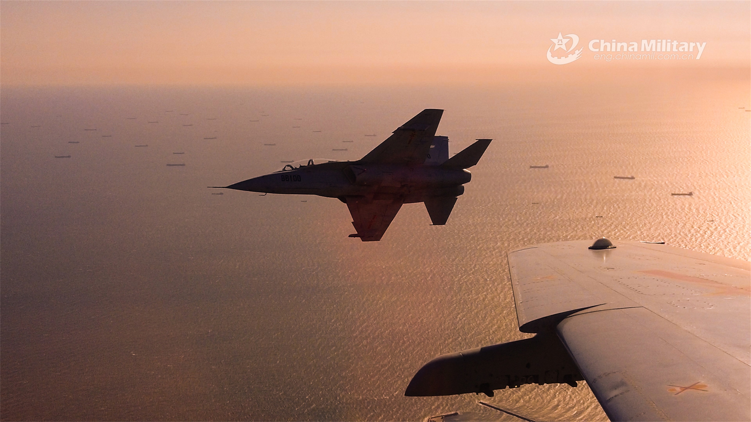 Two two-seat JL-10 trainers attached to a regiment of the Naval Aviation University fly above the sea during a flight training exercise held in early February, 2023. (eng.chinamil.com.cn/Photo by Xu Yinglong)