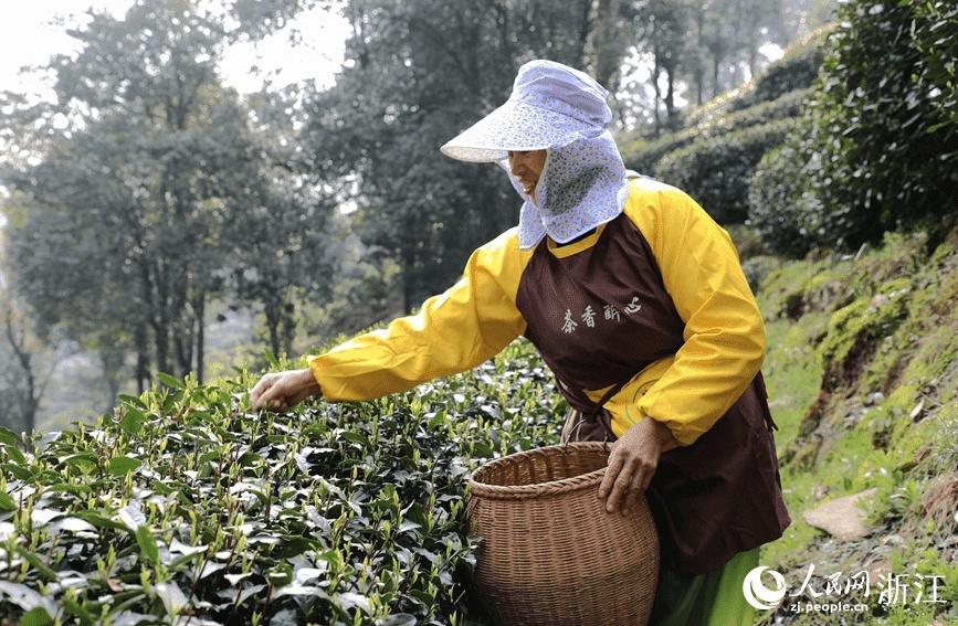 A women picks Longjing tea leaves in Longjing village, Hangzhou city, east China’s Zhejiang Province, March 13, 2023. (People’s Daily Online/Fang Pengyimeng)