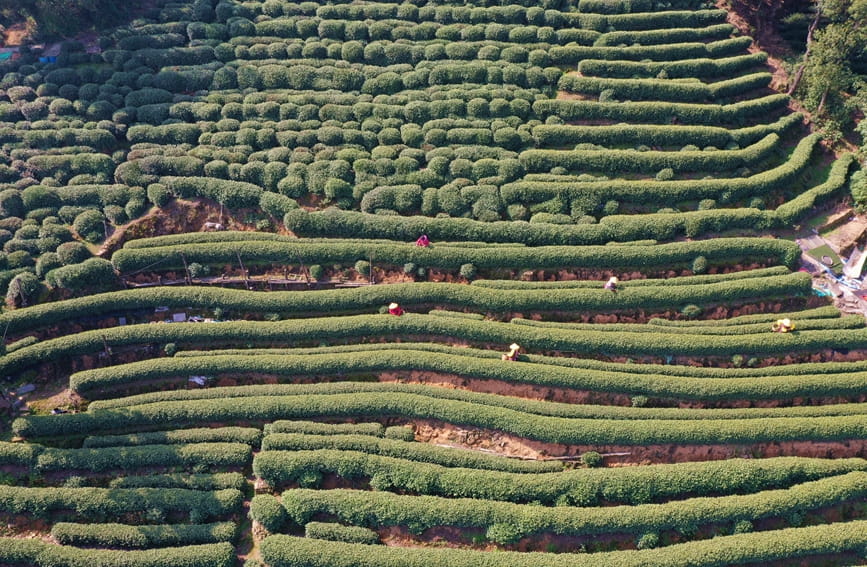 Photo shows the “tea mountain” where farmers harvest Longjing tea leaves in Longjing village, Hangzhou city, east China’s Zhejiang Province, March 13, 2023. (Photo/Fang Jianfei)