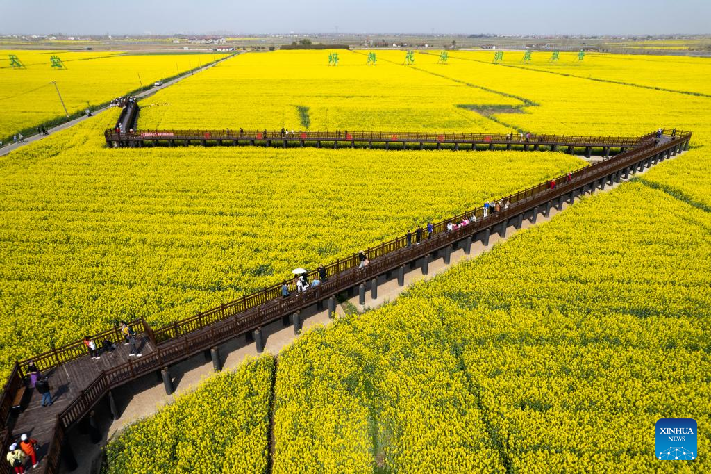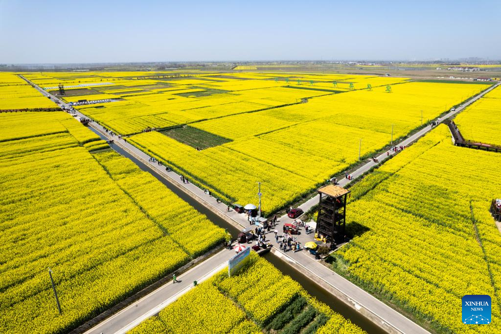 This aerial photo taken on March 14, 2023 shows tourists having fun in cole flower fields in Ziliu Village of Shimeitang Township, Changde City, central China's Hunan Province. (Xinhua/Chen Sihan)
