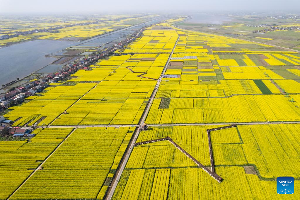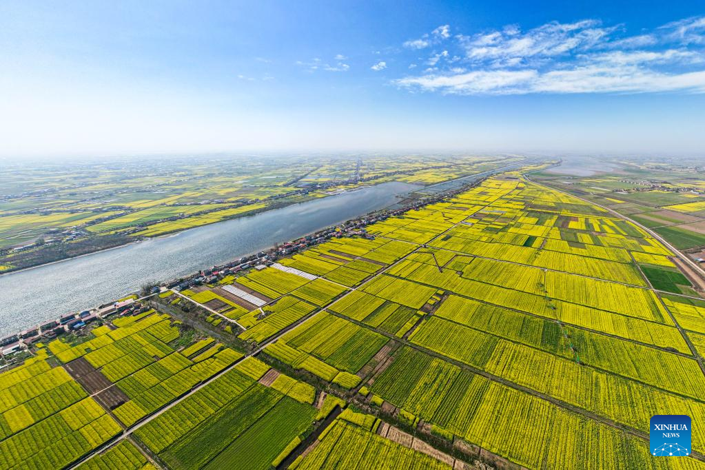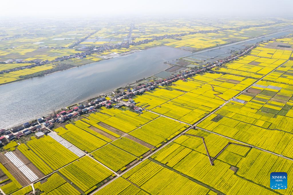This aerial photo taken on March 14, 2023 shows cole flower fields in Ziliu Village of Shimeitang Township, Changde City, central China's Hunan Province. (Xinhua/Chen Sihan)