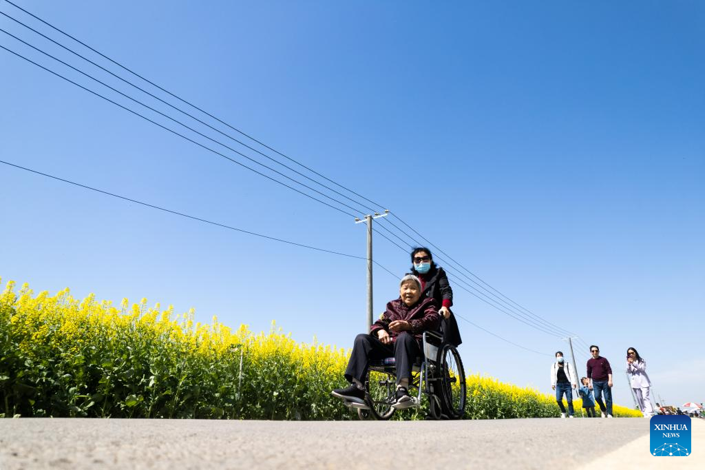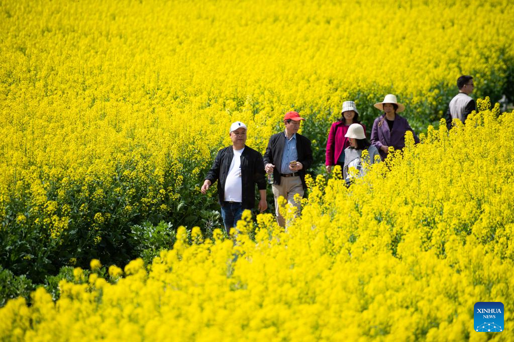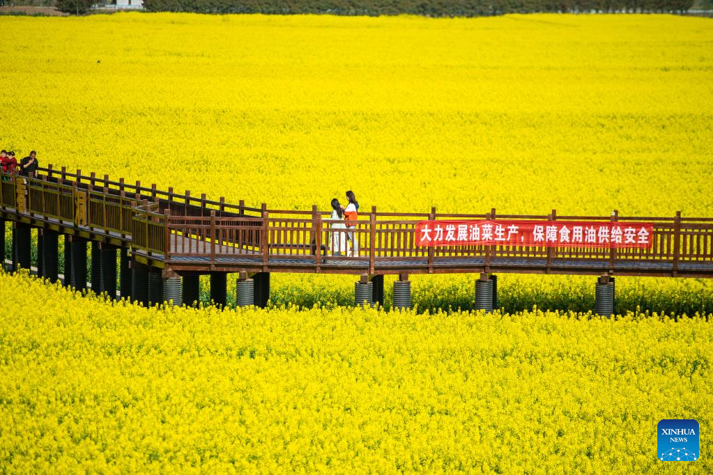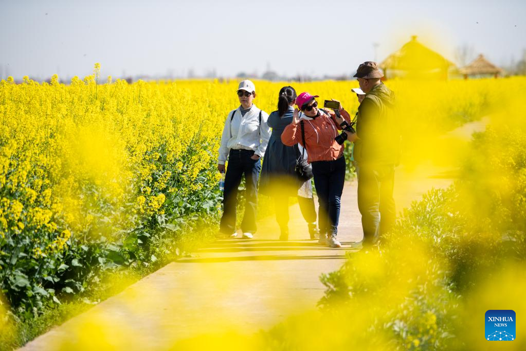Tourists have fun in cole flower fields in Ziliu Village of Shimeitang Township, Changde City, central China's Hunan Province, March 14, 2023. (Xinhua/Chen Sihan)