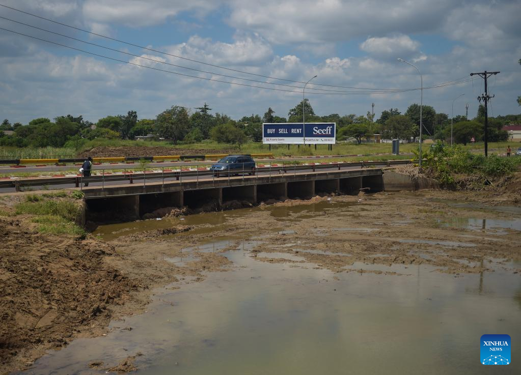 Photo taken on Feb. 28, 2023 shows the Segoditshane bridge channel clogged with waste and silt at the beginning of a dredging project in Gaborone, Botswana. The Chinese Enterprises Association in Botswana handed over the Segoditshane dredging project to Gaborone City Council on March 14. (Photo by Tshekiso Tebalo/Xinhua)