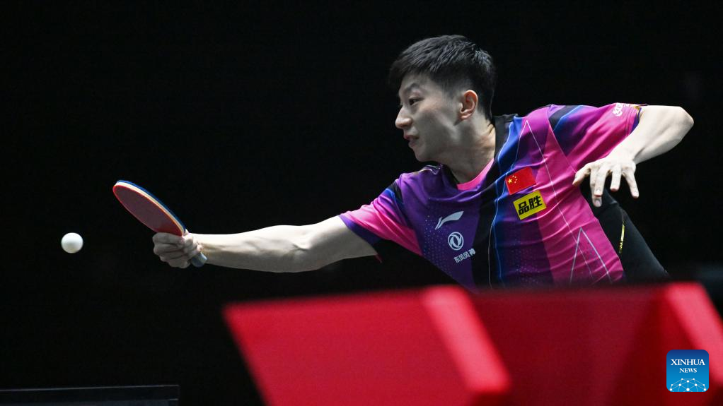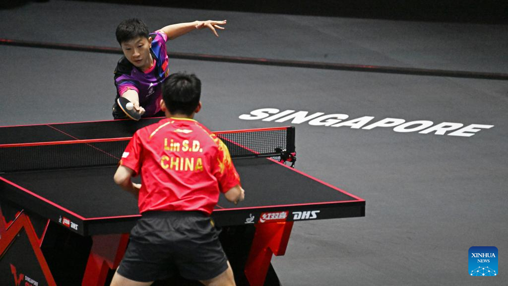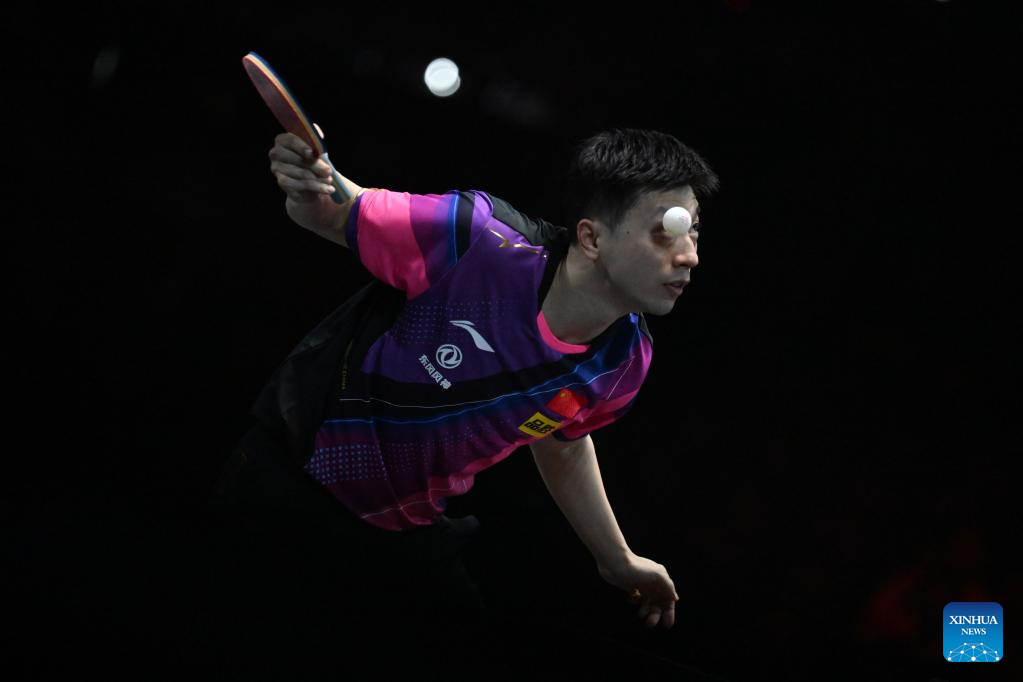 Ma Long (Above) of China hits a return during the men's singles round of 32 match between Ma Long of China and Lin Shidong of China at the World Table Tennis (WTT) Singapore Smash held at OCBC Arena of the Singapore Sports Hub on March 14, 2023. (Photo by Then Chih Wey/Xinhua)
