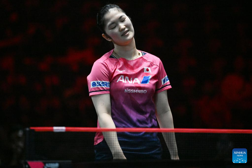 Kihara Miyuu of Japan reacts during the women's singles round of 32 match between Wang Manyu of China and Kihara Miyuu of Japan at the World Table Tennis (WTT) Singapore Smash held at OCBC Arena of the Singapore Sports Hub on March 14, 2023. (Photo by Then Chih Wey/Xinhua)