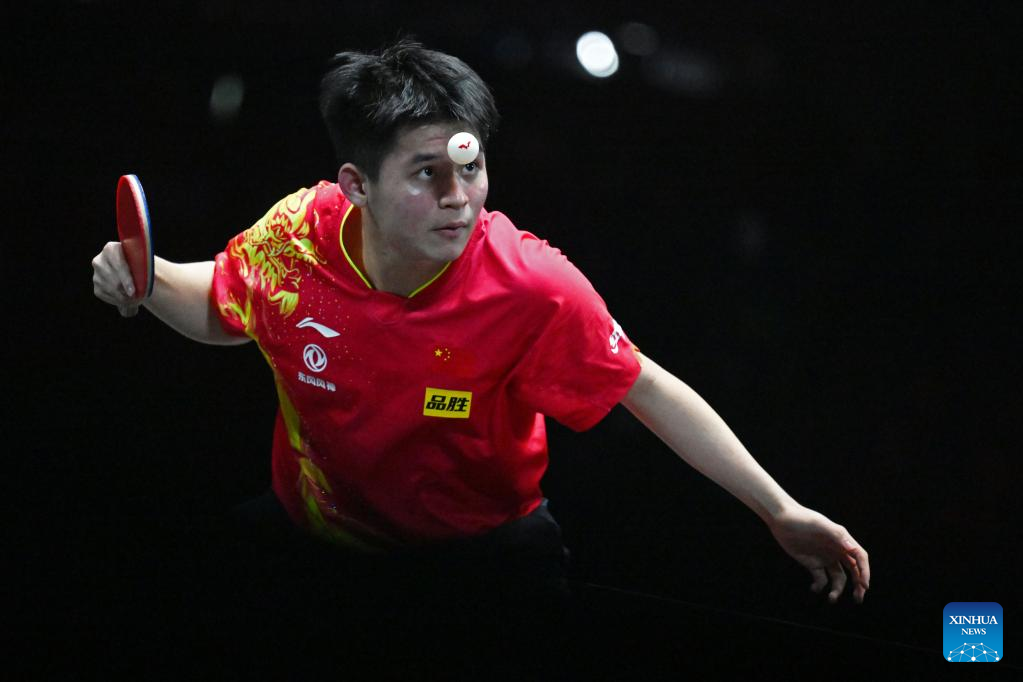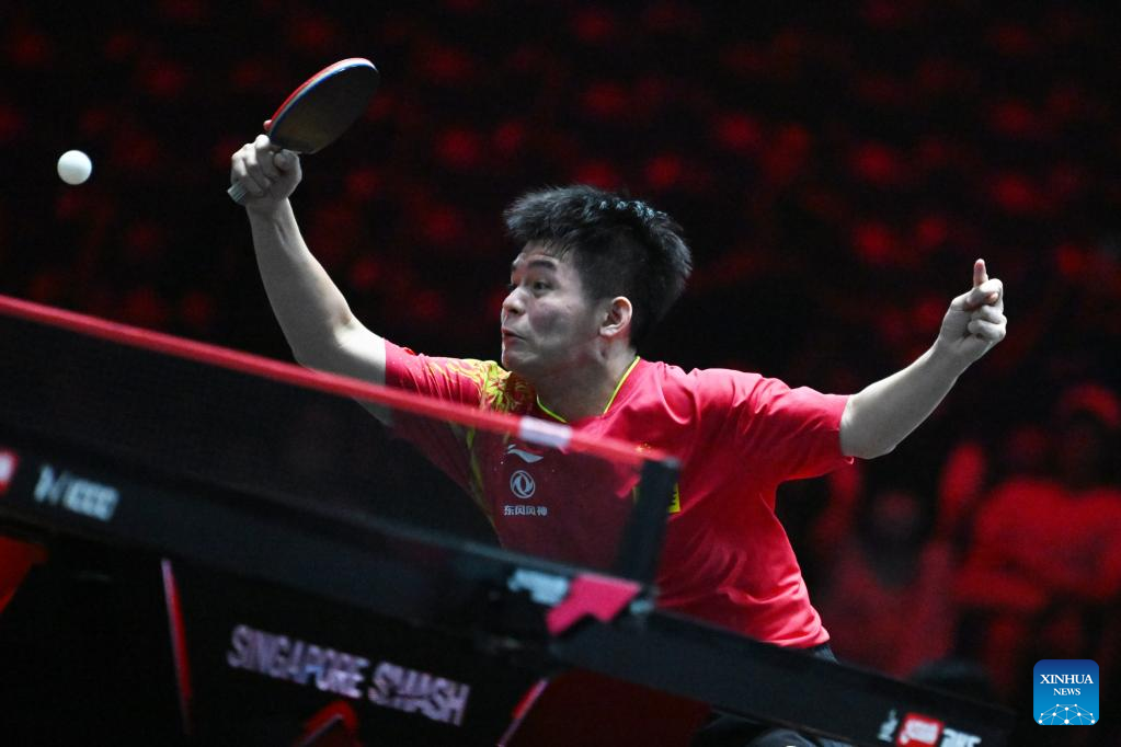 Lin Shidong of China hits a return during the men's singles round of 32 match between Ma Long of China and Lin Shidong of China at the World Table Tennis (WTT) Singapore Smash held at OCBC Arena of the Singapore Sports Hub on March 14, 2023. (Photo by Then Chih Wey/Xinhua)