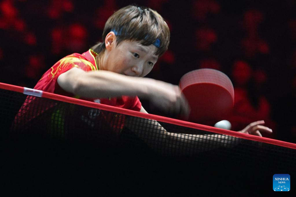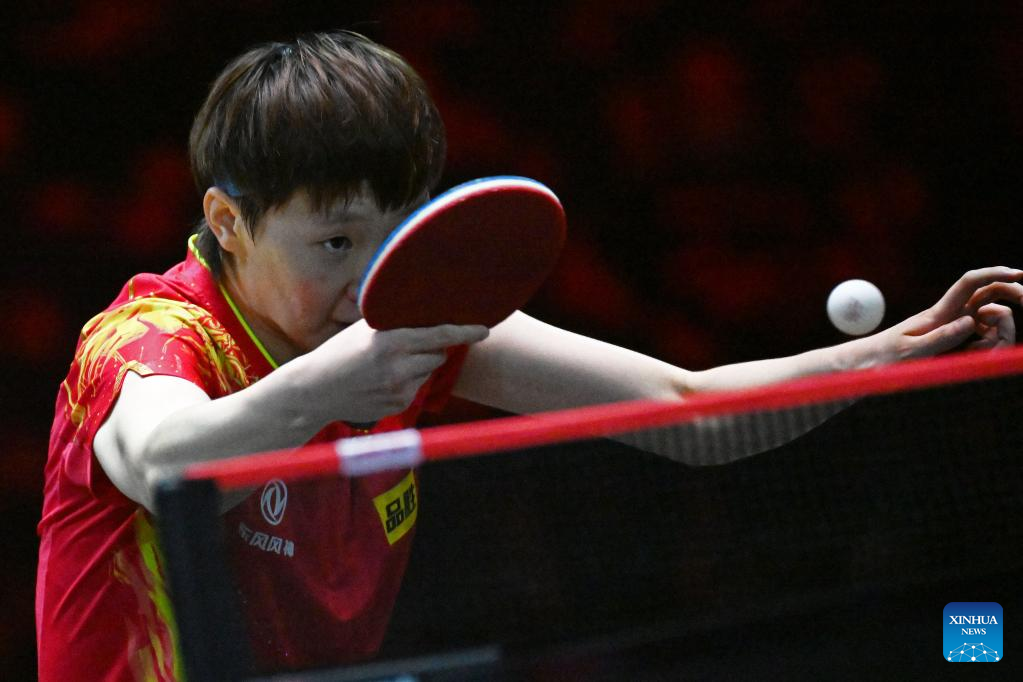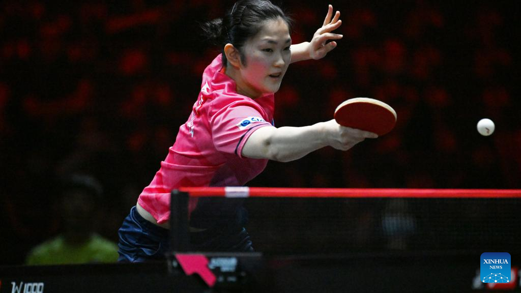 Wang Manyu of China hits a return during the women's singles round of 32 match between Wang Manyu of China and Kihara Miyuu of Japan at the World Table Tennis (WTT) Singapore Smash held at OCBC Arena of the Singapore Sports Hub on March 14, 2023. (Photo by Then Chih Wey/Xinhua)