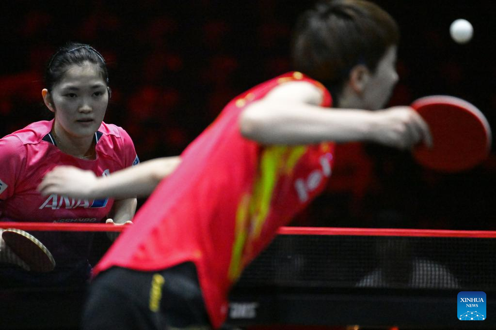 Kihara Miyuu (L) of Japan competes during the women's singles round of 32 match between Wang Manyu of China and Kihara Miyuu of Japan at the World Table Tennis (WTT) Singapore Smash held at OCBC Arena of the Singapore Sports Hub on March 14, 2023. (Photo by Then Chih Wey/Xinhua)