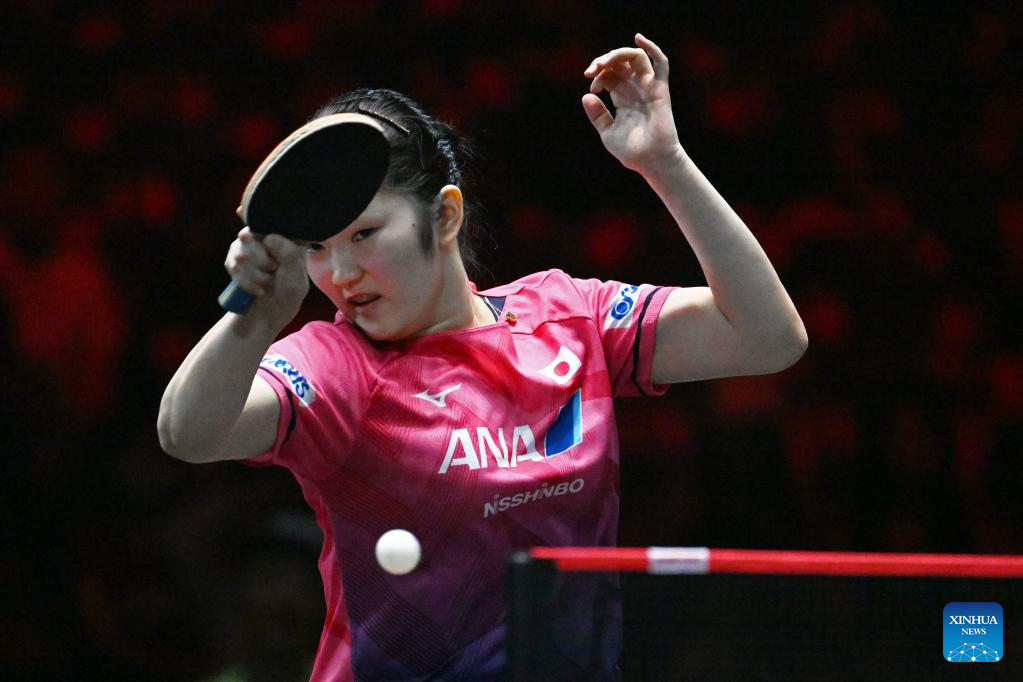 Kihara Miyuu of Japan hits a return during the women's singles round of 32 match between Wang Manyu of China and Kihara Miyuu of Japan at the World Table Tennis (WTT) Singapore Smash held at OCBC Arena of the Singapore Sports Hub on March 14, 2023. (Photo by Then Chih Wey/Xinhua)