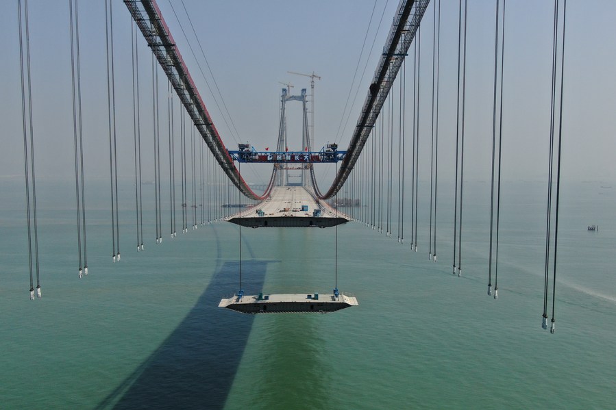 This aerial photo taken on Feb. 22, 2023 shows the construction site of Lingdingyang bridge in south China's Guangdong Province. (Xinhua/Deng Hua)