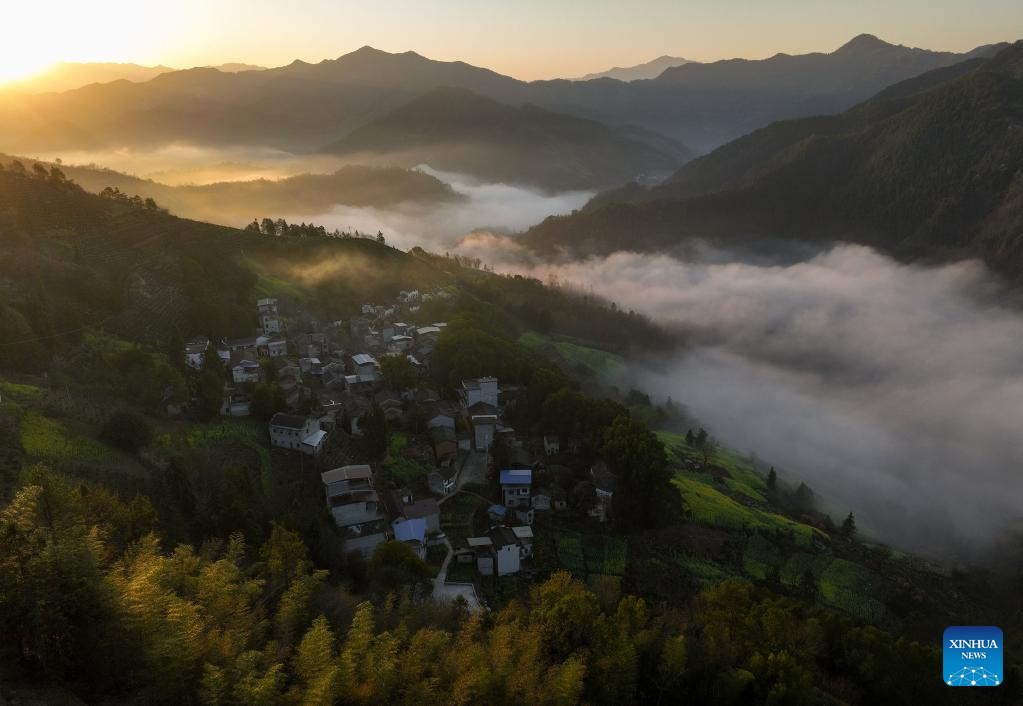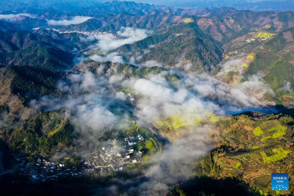 This aerial photo taken on March 14, 2023 shows the scenery of a sea of clouds at Shitan Village in Shexian County of Huangshan City, east China's Anhui Province. (Photo by Fan Chengzhu/Xinhua)