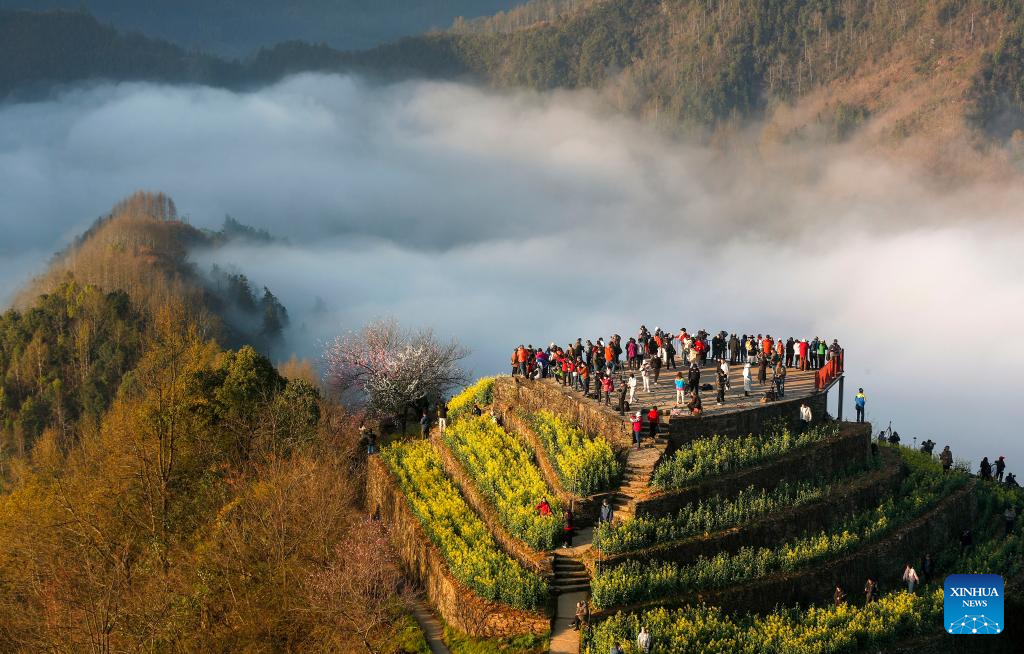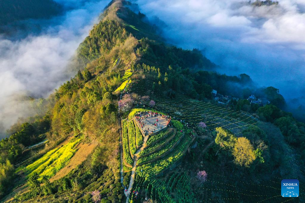 This aerial photo taken on March 14, 2023 shows tourists enjoying the scenery of a sea of clouds at Shitan Village in Shexian County of Huangshan City, east China's Anhui Province. (Photo by Fan Chengzhu/Xinhua)