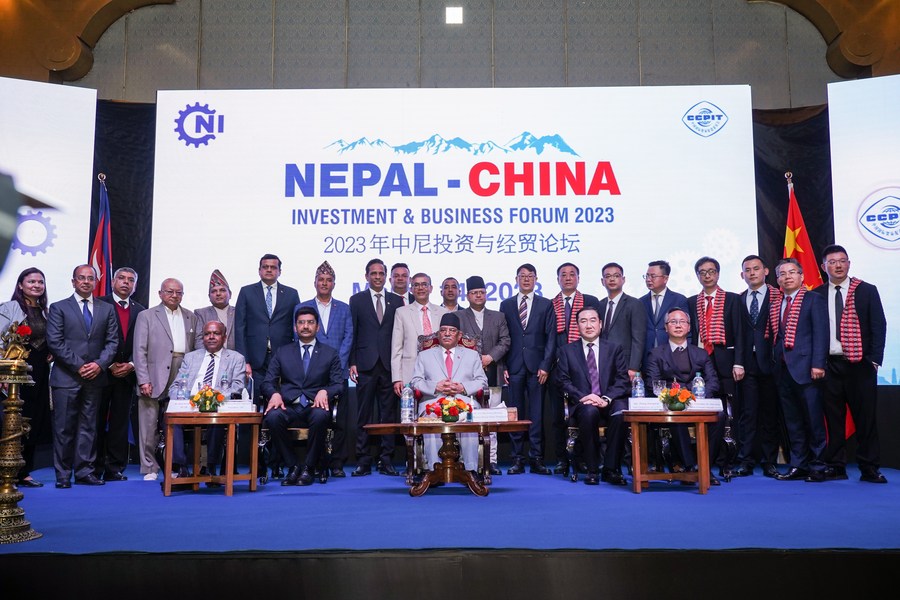 Nepali Prime Minister Pushpa Kamal Dahal (C) attends the Nepal-China investment and business forum 2023 in Kathmandu, Nepal on March 14, 2023. (Photo by Hari Maharjan/Xinhua)