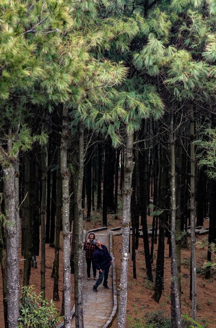 Wang Shigui, a ranger, and his wife walk along a trail to a lookout tower in Huamu mountain in Luliang county, Qujing, southwest China’s Yunnan Province, on March 12. (Xinhua/Jiang Wenyao)