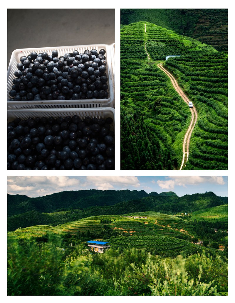 Combo photo shows blueberries and blueberry bases in Kaili city, southwest China’s Guizhou Province. (Photo courtesy of the forestry bureau of Kaili)