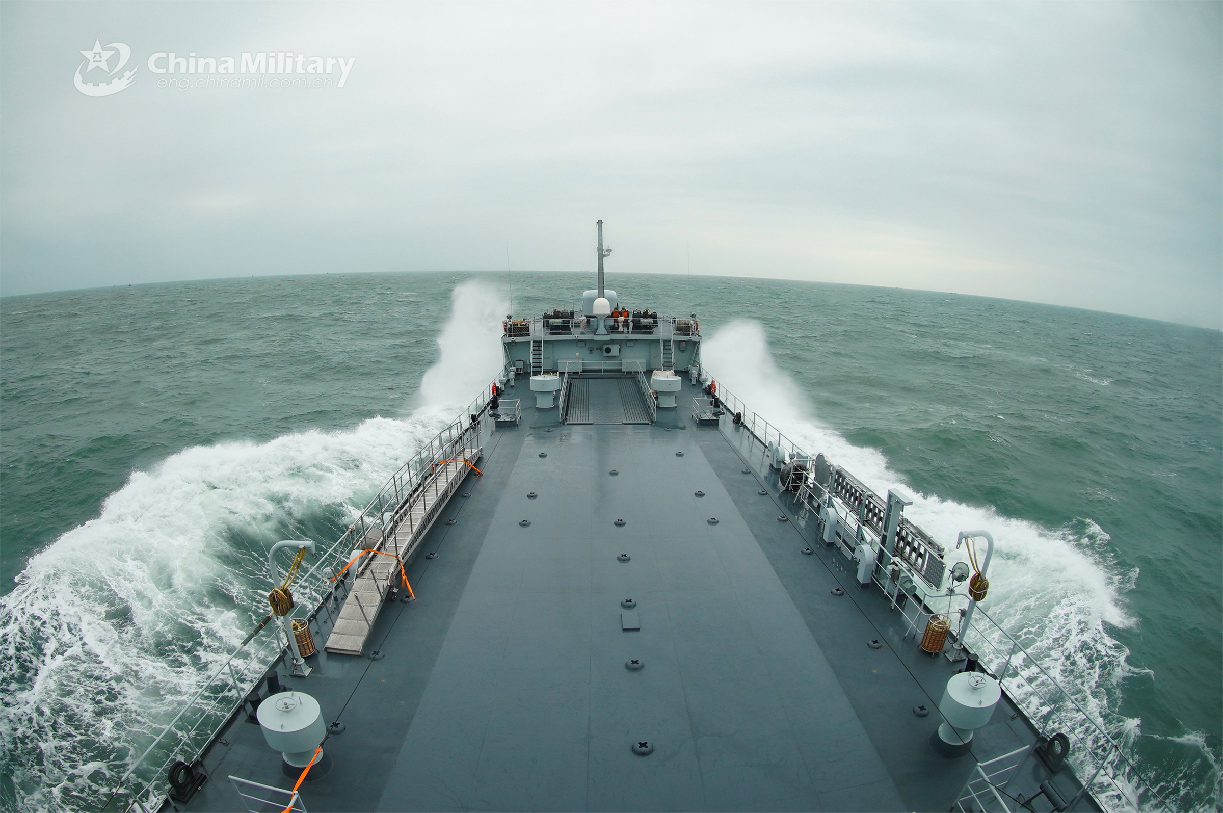A landing ship attached to a landing ship group with the navy under the PLA Eastern Theater Command cleaves through the waves during a maritime training exercise in early March, 2023. (eng.chinamil.com.cn/Photo by Li Hao)