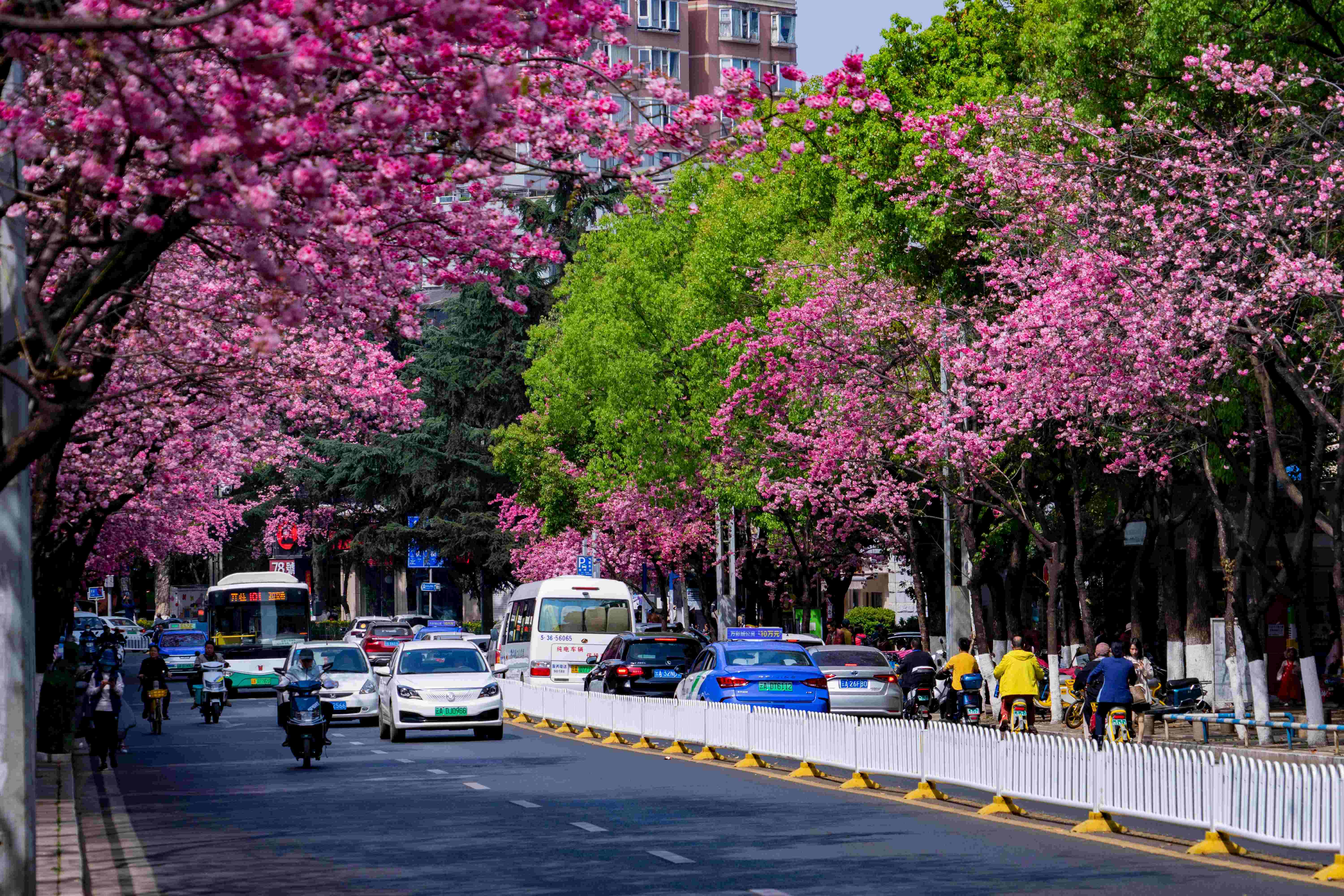 Photo taken on March 11, 2023 shows cherry blossoms on the two sides of a street in Kunming, southwest China's Yunnan province. (People's Daily Online/Zheng Yi)