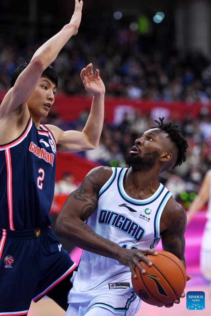 Duop Reath (R) of Qingdao Eagles breaks through during the 35th round match between Qingdao Eagles and Guangdong Southern Tigers at the 2022-2023 season of the Chinese Basketball Association (CBA) league in Qingdao, east China's Shandong Province, March 15, 2023. (Xinhua/Li Ziheng)