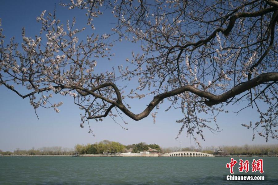 Peach blossoms are in full bloom beside the Seventeen-Arch Bridge at the Summer Palace, Beijing, March 15, 2023. (Photo: China News Service/Sheng Jiapeng)