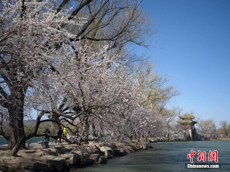Peach blossoms are in full bloom beside the Seventeen-Arch Bridge at the Summer Palace, Beijing, March 15, 2023. (Photo: China News Service/Sheng Jiapeng)