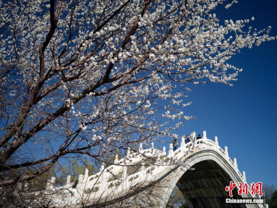 Peach blossoms are in full bloom beside the Seventeen-Arch Bridge at the Summer Palace, Beijing, March 15, 2023. (Photo: China News Service/Sheng Jiapeng)