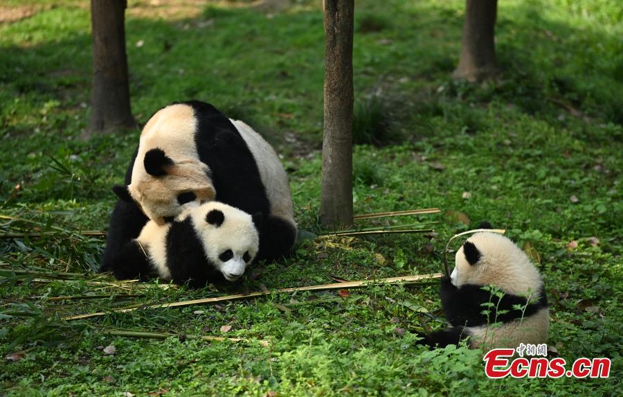 A pigeon pair of giant panda cubs Yu Ke and Yu Ai play with their mom Er Shun at Chongqing Zoo, March 14, 2023. (Photo: China News Service/Chen Chao)