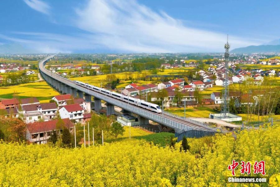 A high-speed train runs through a blooming cole field in Hanzhong, northwest China's Shaanxi Province. (Photo: China News Service/Luo Hantao)