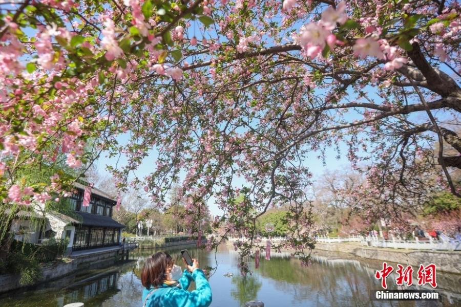 Chinese crabapple trees blossom near the Mochou statue, painting Mochou Lake Park pink in Nanjing, east China's Jiangsu Province, March 14, 2023. (Photo: China News Service/Yang Bo)