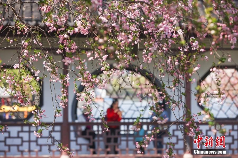 Chinese crabapple trees blossom near the Mochou statue, painting Mochou Lake Park pink in Nanjing, east China's Jiangsu Province, March 14, 2023. (Photo: China News Service/Yang Bo)