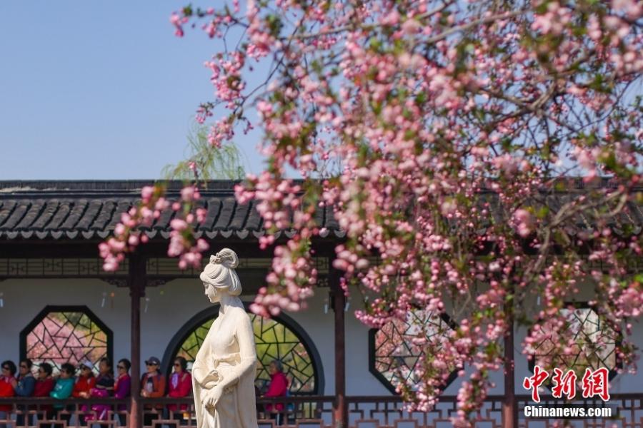 Chinese crabapple trees blossom near the Mochou statue, painting Mochou Lake Park pink in Nanjing, east China's Jiangsu Province, March 14, 2023. (Photo: China News Service/Yang Bo)