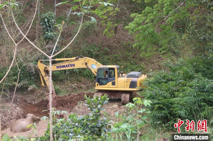 An excavator digs a passage for the trapped elephant to climb out of the pond. (Photo/Gao Huaisong)