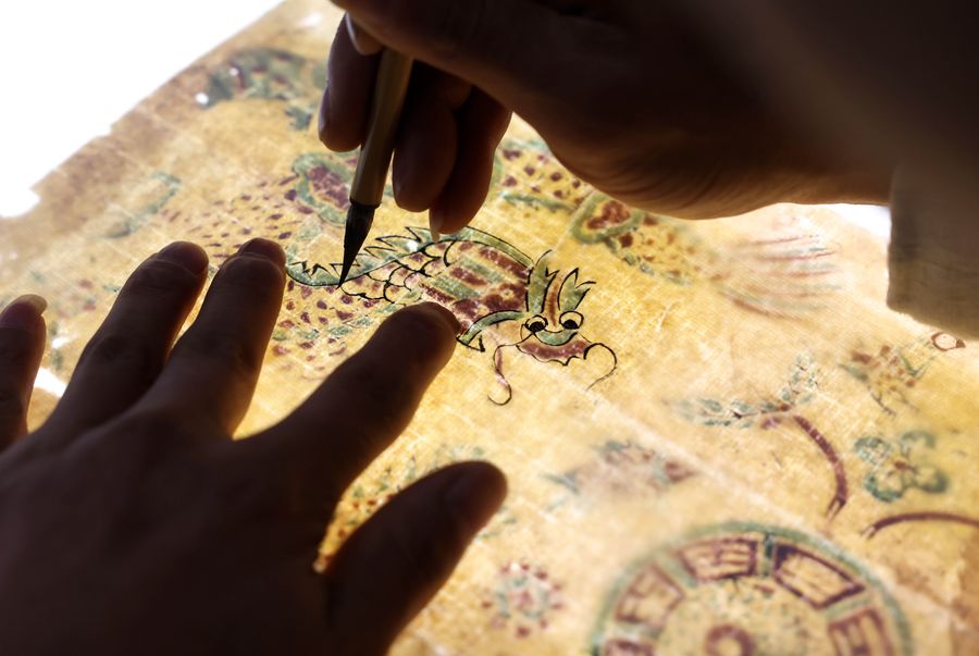 Photo shows Tong Min sketching the painting in his studio. (Photo by Xie Chen)