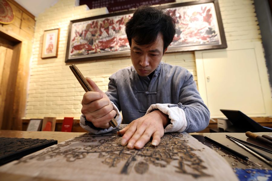 Photo shows Tong Min carving the engraving of a painting in his studio. (Photo by Xie Chen)