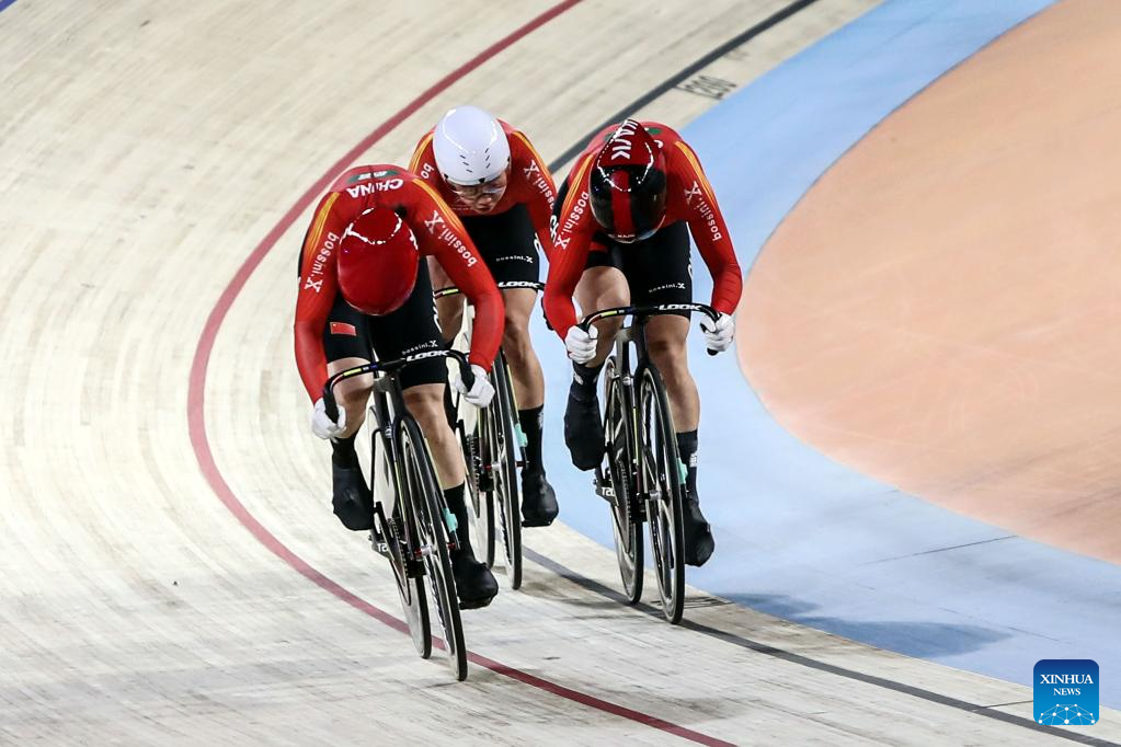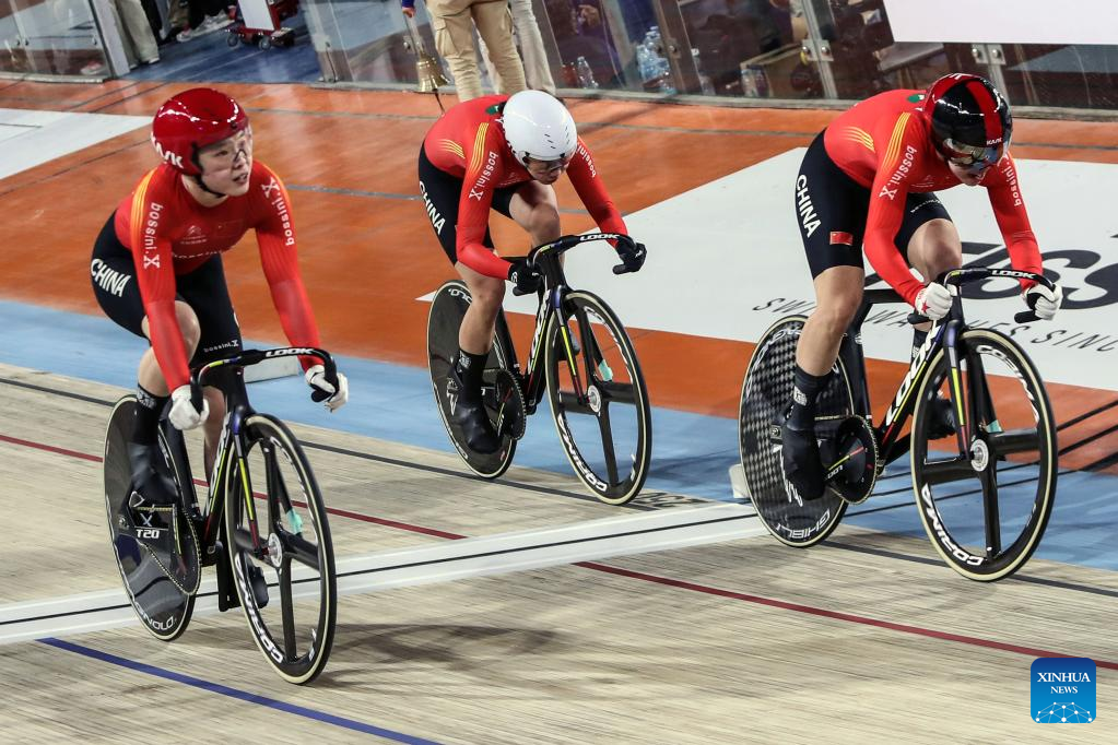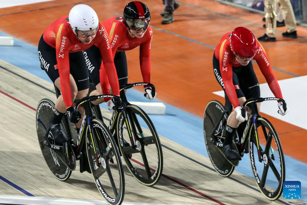 Guo Yufang, Bao Shanju and Yuan Liying of Team China compete during the women's team sprint finals at the 2023 UCI Track Nations Cup in Cairo, Egypt, March 15, 2023. (Xinhua/Ahmed Gomaa)
