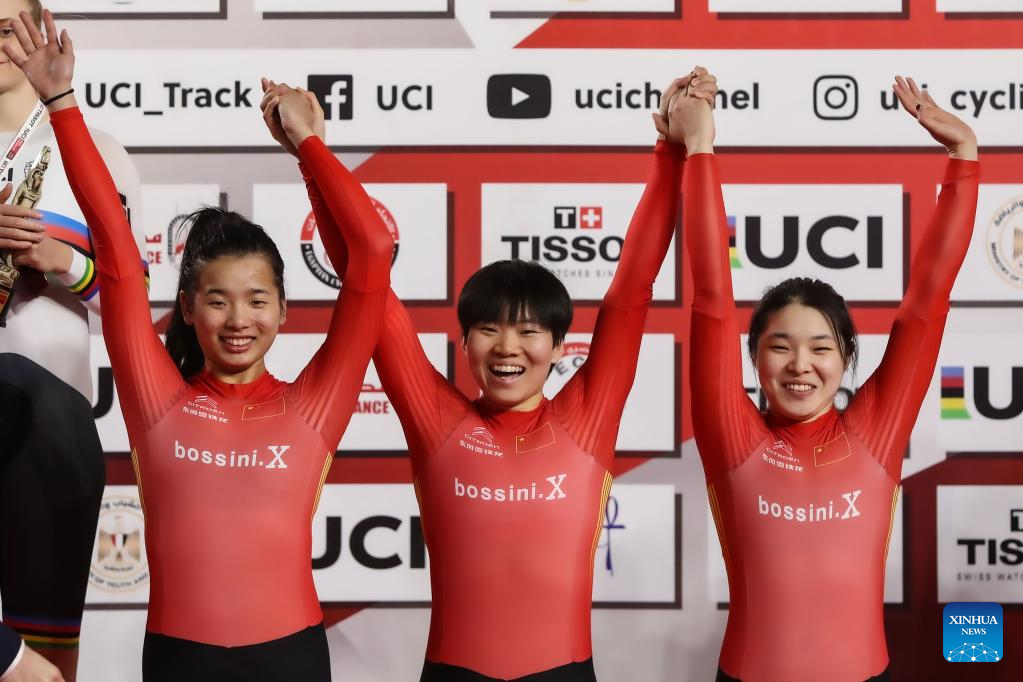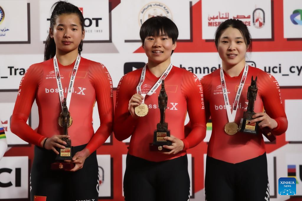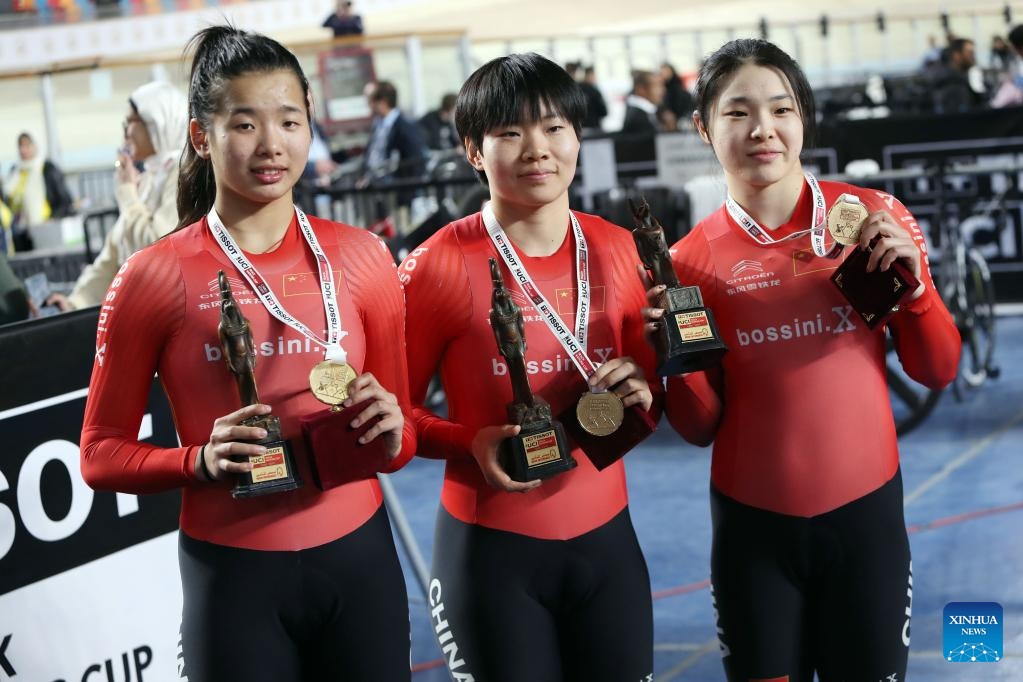 Guo Yufang (R), Bao Shanju (C) and Yuan Liying of Team China pose for photos with gold medals after an award ceremony after winning the women's team sprint finals at the 2023 UCI Track Nations Cup in Cairo, Egypt, March 15, 2023. (Xinhua/Ahmed Gomaa)