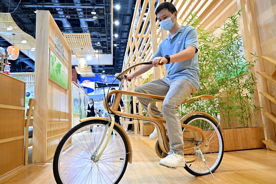 A visitor tries a bamboo bicycle at the environmental services exhibition during the 2022 China International Fair for Trade in Services (CIFTIS) in Beijing, capital of China, Sept. 3, 2022. (Xinhua/Li Xin)