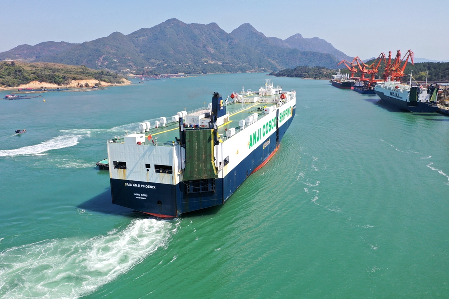 Photo shows a large ro-ro ship bound for Mexico leaving Sanduao Port in Ningde, southeast China’s Fujian Province. (Photo/Chen Da)