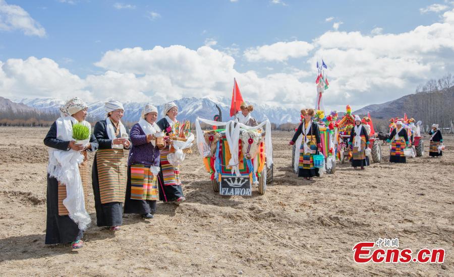 Villagers take part in a ceremony marking the start of this year's plowing season in Lhasa, southwest Tibet Autonomous Region, March 16, 2023. (Photo/China News Service)