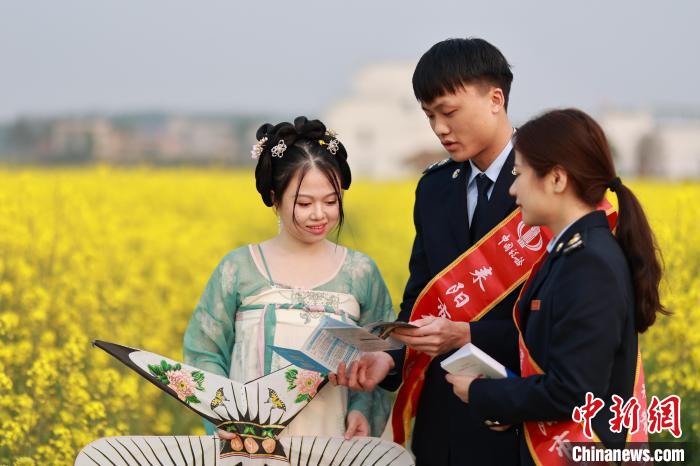 Two tax officials of Leiyang city, central China's Hunan Province explain policies to a visitor in a rapeseed field. (Photo/Liu Wentao)